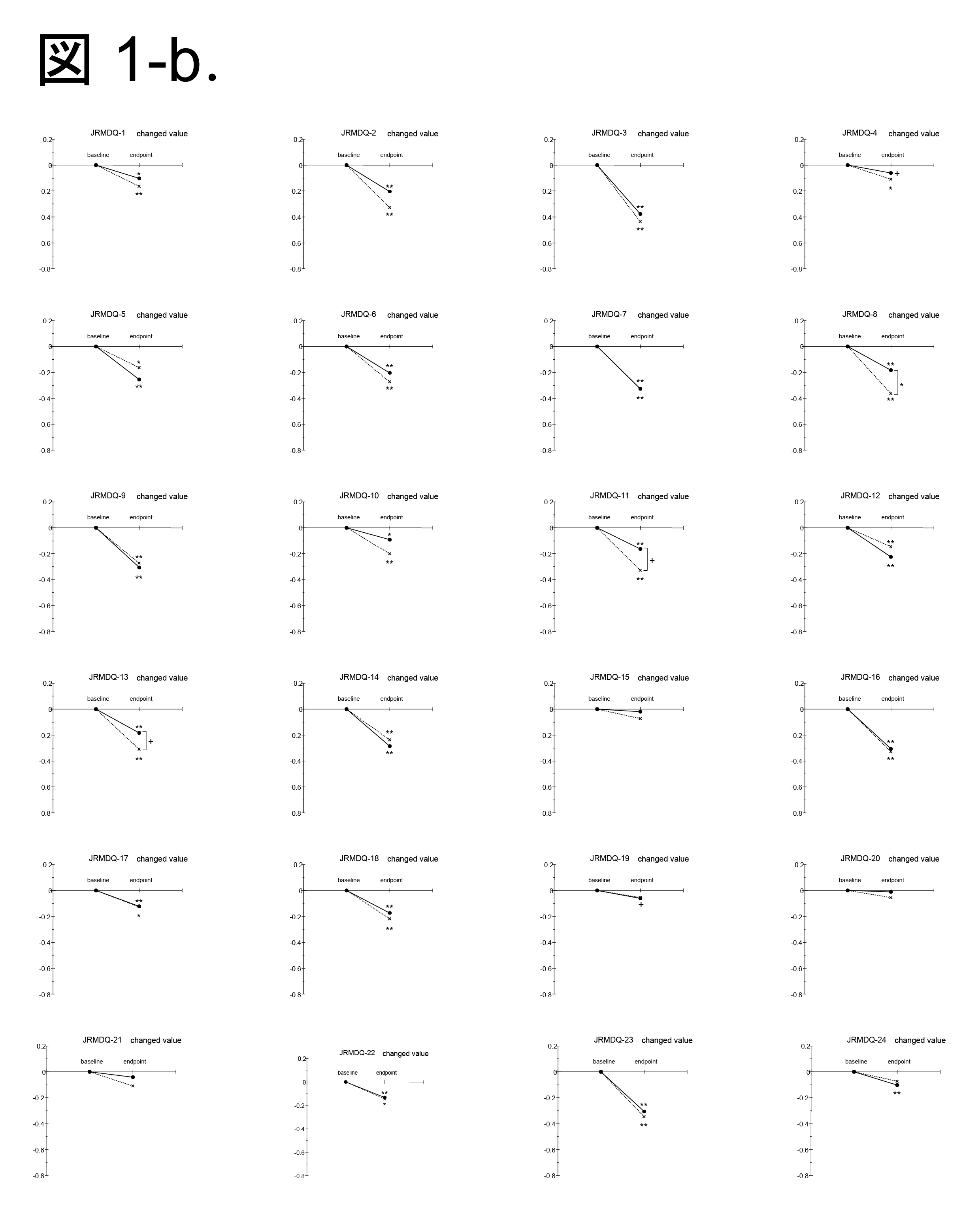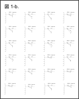 たとえば、2剤同士を24個の評価項目に従って、実測値と変化量とで比較するような研究例では、下図1-a,bに示す48枚のグラフで表現する代わりに、下図2のようにたった1枚のNMatrix表示で、研究成果からのメッセージを、一瞬で明快に伝えることが可能です。