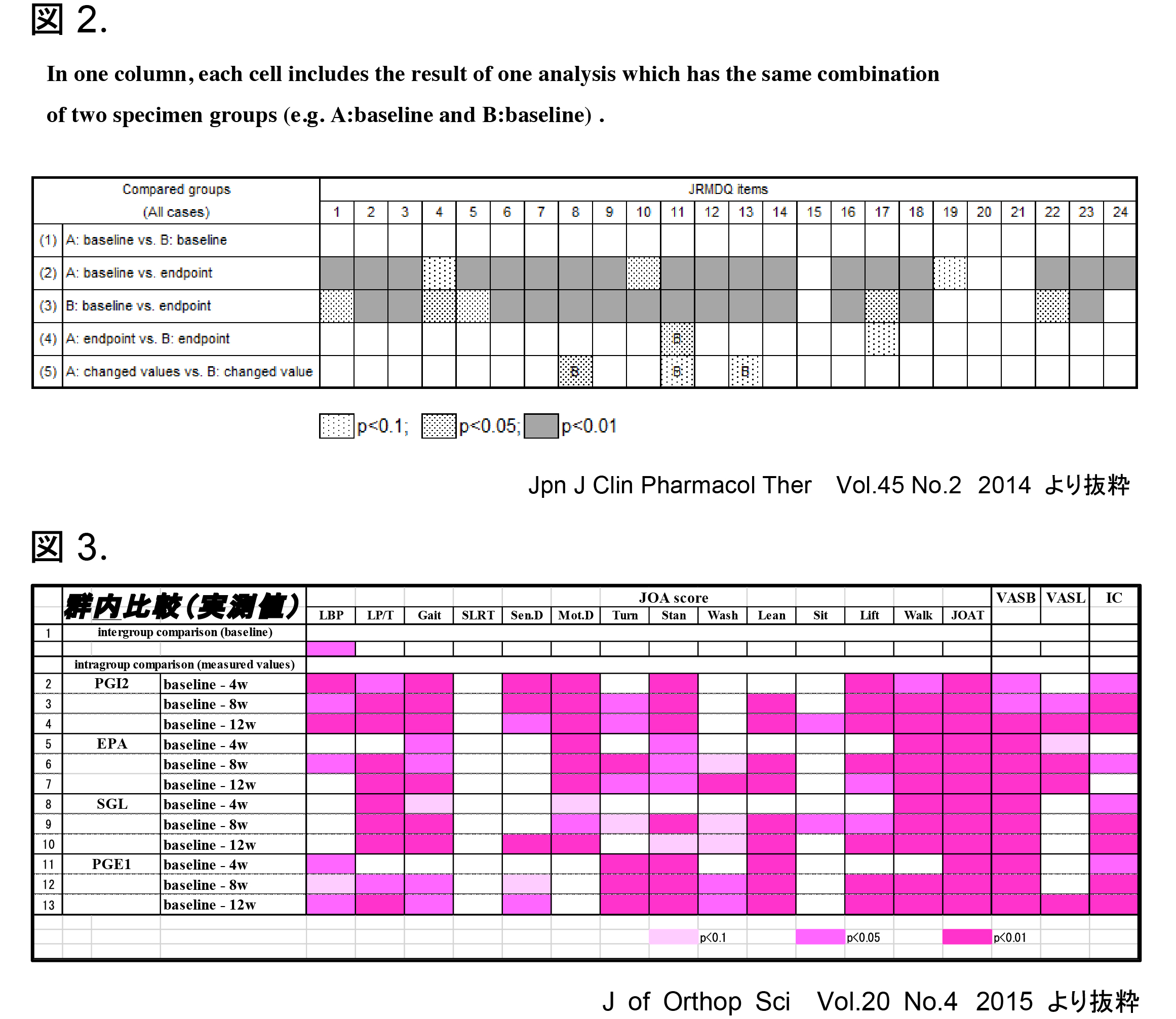 新しい統計表示法NMatrixは、多数のグラフをそのまま掲載するのではなく、1枚のグラフに表されている有意差の大小や変化量の程度を1個のcellに置き換え、複数の検定方法で導き出された多種多様な検定結果を、たった1枚のマトリックスで表すツールです。